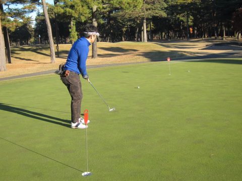 コース前のパター確認をする須賀IMゴルフ実行委員長。