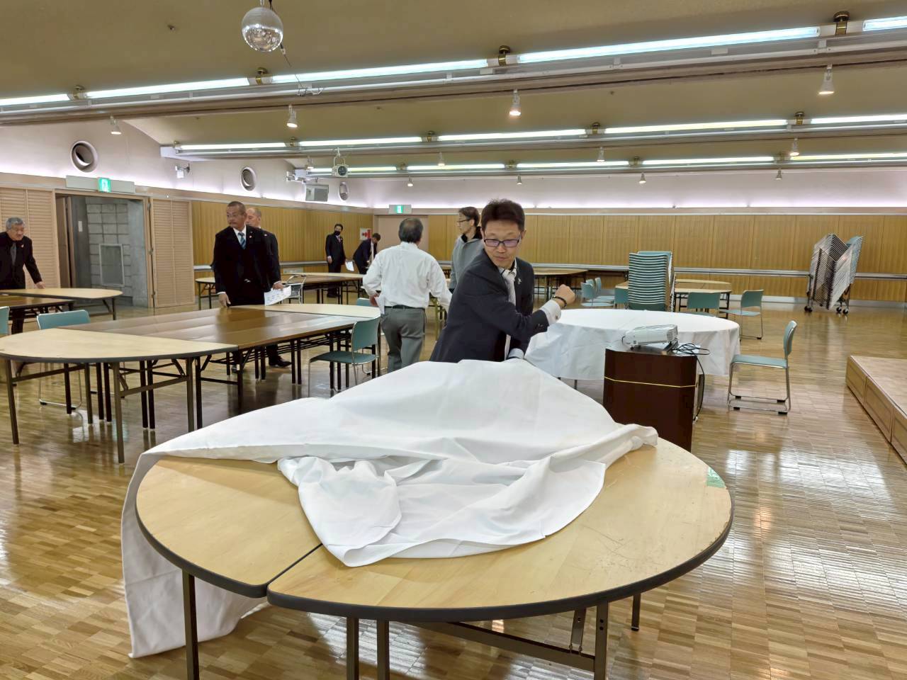 今井会員が華麗な手さばきでテーブルクロスを敷きました。